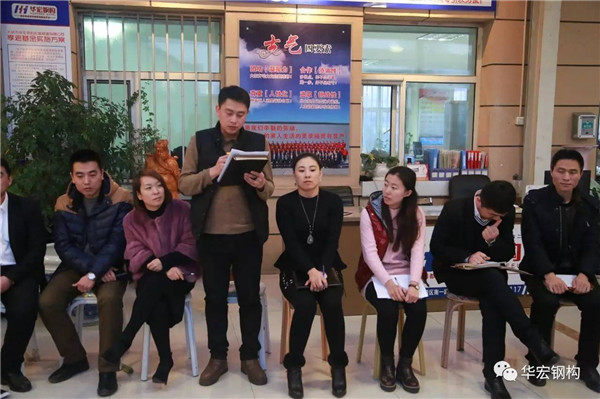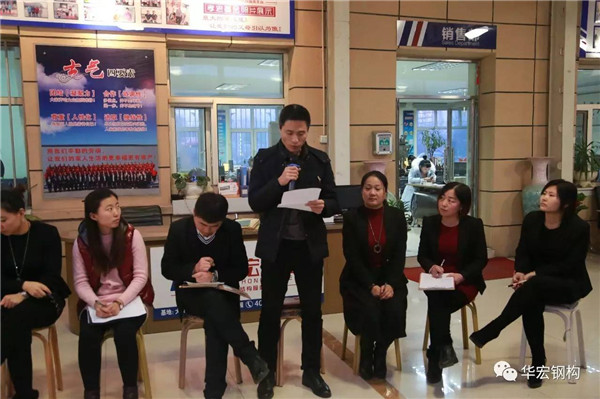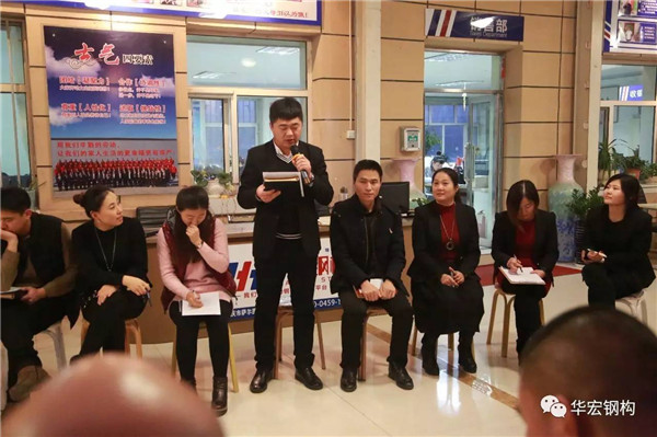 2016年12月15日15时,华宏钢构2016年度十大标兵评选会议在公司总部阳光大厅召开,会议由行政**经理李德伟主持,朱宏志、朱宏勇、刘肖、张章、高霞、林春、潘宏娟、崔凤兰、王学东、王天宇、徐海峰、孙晓丽、苑孝南、张雪立、牟桂梅、周立彬、牟永平、王忠明、刘文举、赵影、朱宏基等人参加了会议,同时会议还邀请了各车间和办公室基层家人列席了会议。