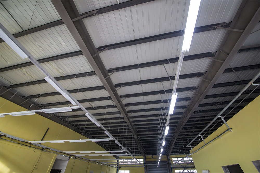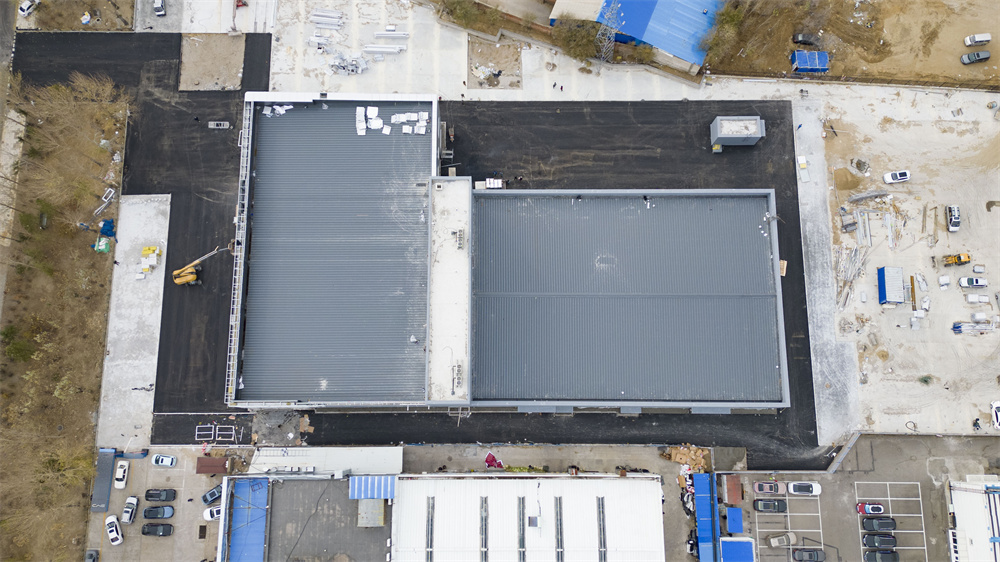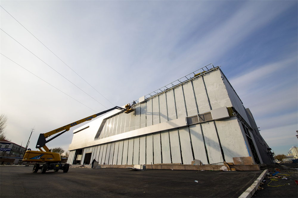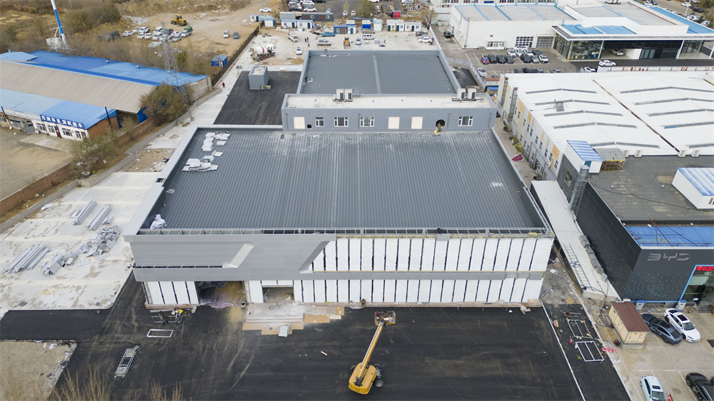 项目特点:该项目销售区为钢框架结构,维修区为门式钢架结构。钢框架部分结构夹层多种标高,增加了现场施工难度。屋面局部设置高位水箱间。维修区部分为34.61m跨度无中柱门式钢架结构,内部设置多个夹层梁,屋面保温为玻璃丝绵现场复合板,屋面外板均为475型360°咬合连接板。墙体均为士建墙体。